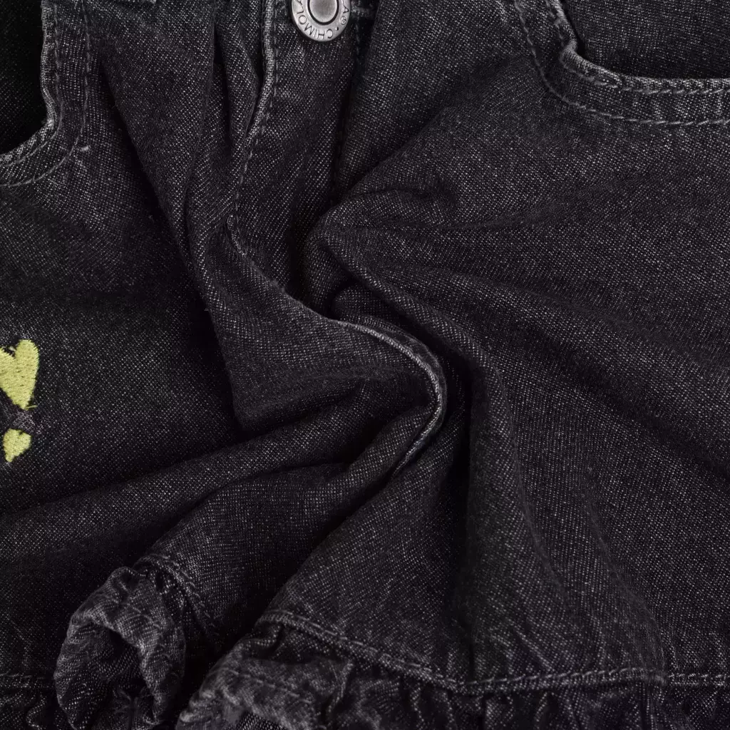 Una versión dulce y romántica del clásico short de jean. Realizado en denim, ofrece una estructura firme con un calce cómodo y femenino. El diseño presenta una cintura fruncida con doble botón, bolsillos delanteros funcionales y un ruedo con volado fruncido que suma movimiento. El frente incluye un delicado bordado de paloma, mientras que el dorso se roba todas las miradas: dos bolsillos traseros aplicados con moños decorativos y un detalle bordado…pura ternura.